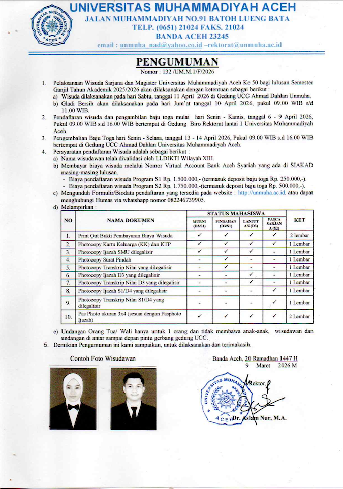 Pelaksanaan Wisuda Sarjana dan Magister Universitas Muhammadiyah Aceh ke 50 bagi lulusan Semester Ganjil Tahun Akademik 2025/2026 akan dilaksanakan dengan ketentuan sebagai berikut : a) Wisuda dilaksanakan pada hari Sabtu, Tanggal 11 April 2026 di Gedung UCC Ahmad Dahlan Unmuha; b) Gladi Bersih akan dilaksanakan pada hari Jum’at pada Tanggal 10 April 2026, pukul 09.00 WIB s/d 11.00 WIB. Pendaftaran Wisuda dan pengambilan baju toga mulai hari Senin – Kamis, pada Tanggal 6 -9 April 2026, pukul 09.00 WIB s.d 16.00 WIB bertempat di Gedung Biro Rektorat Lantai I Universitas Muhammadiyah Aceh. Guna mendapatkan informasi lengkap dan lebih jelas, dapat dibaca pada pengumuman di bawah ini :
